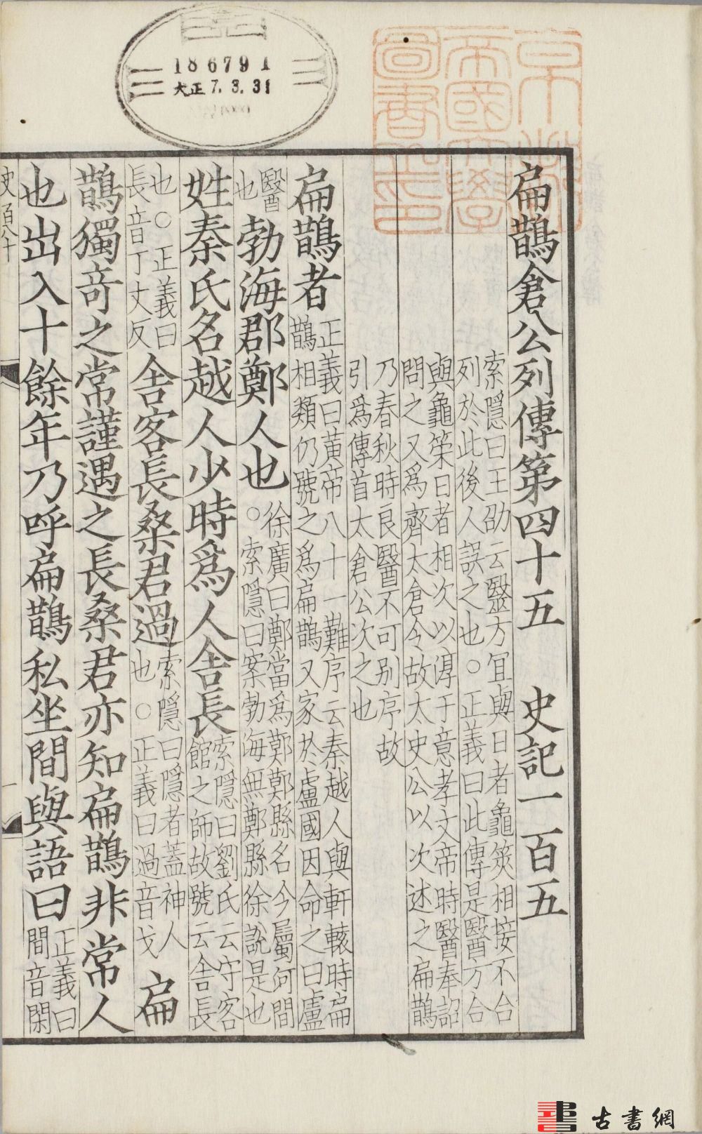 《扁鹊仓公列传》是《史记》(卷一百五)列传第四十五。其内容为记叙战国时的扁鹊、西汉初的淳于意(世称:仓公)两位名医的医事活动。此本为影刻米泽侯所藏南宋黄善夫本《史记》中的《扁鹊仓公列传》,以及汇考二卷、并附考异、备参,作为医学馆的教材使用。此为日本嘉永二年存诚药室刊本。