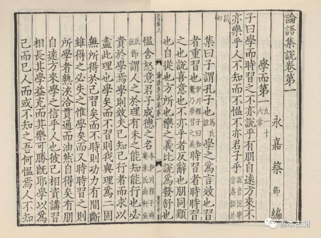 此本前镌有文学掾姜文龙于淳佑六年丙午所写的一篇短跋,称:“晦庵先生尝语门人曰:‘看《集注》熟了,更看《集义》,方始无疑。’又曰:‘不看《集义》,终是不浃洽。’永嘉蔡先生《集说》之作,自《集义》中来,本之明道、伊川二先生,参以晦庵《或问》。而于晦庵、南轩先生,尤得其骨髓。盖南轩学于口五峰先生,又与晦庵相讲磨,故语说多精切。是书也,说虽博,而所会者约;文虽约,而所该者博,大有益于后学,遂请刊于湖頖。淳佑丙午冬至文学掾姜文龙谨书。”这段跋文阐述了《论语集说》的渊源和价值所在。