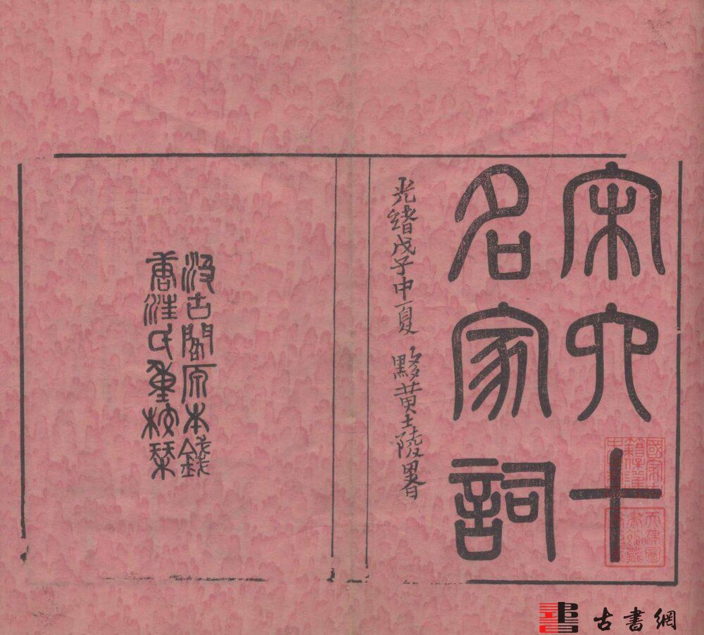 扉页刊牌记:宋六十名家詞,光緒戊子中夏黟黃士陵署。汲古閣原本錢塘汪氏重校槧