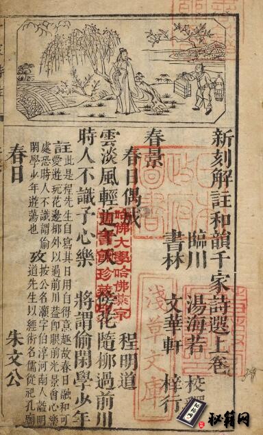 《新刻解注和韵千家诗选》是由宋代谢枋得编(皆七言律诗)。它是我国旧时带有启蒙性质的诗歌选本。因为它所选诗歌大多是唐宋时的名家名篇,易学好懂。此本为明万历时期文华轩刊本。