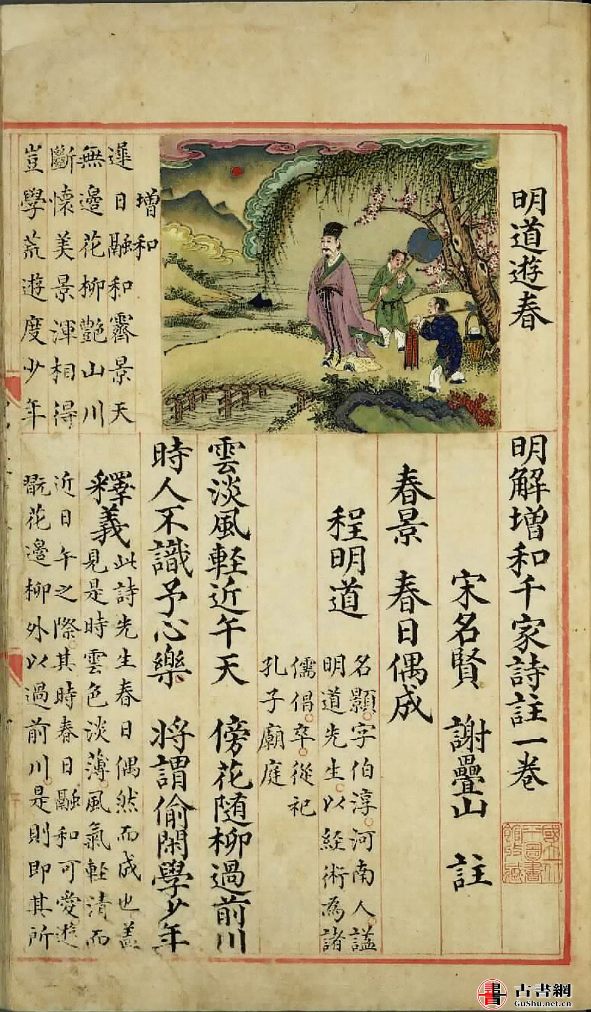 已知《明解增和千家诗注》存世仅七绝与七律二卷,上下册。卷一上册藏于台北故宫博物院(此本),卷二下册藏于中国国家图书馆。台北故宫博物院藏彩绘本《明解增和千家诗注》,仅存卷一,录七言绝句七十一首,间有脱页,已重裱,全书版式寛大,以厚皮纸抄写,朱绘边栏界行、版心鱼尾,上图下文,图旁题和诗,但位置不固定,有时图居中,和诗在左右,有时图居右或左。插图彩绘,用色鲜明,像是明宫廷画师所作,极可能是皇子的教科书。