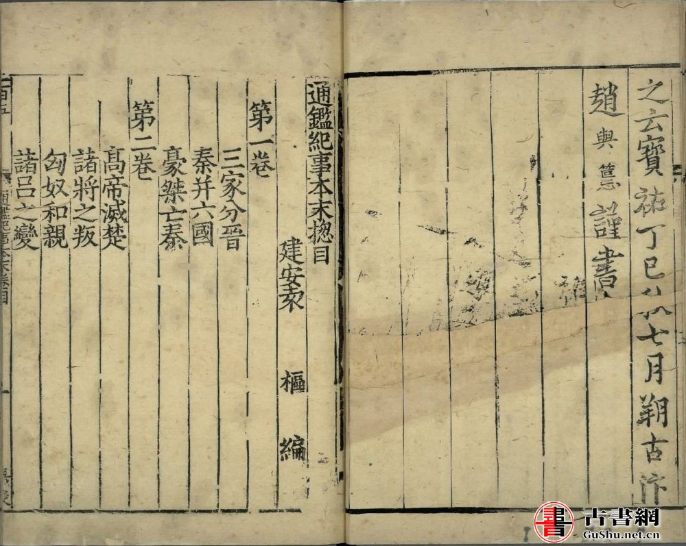 《通鉴纪事本末》大约成书于南宋乾道九年(1173),初刊于南宋淳熙二年(1175)严陵 [1] 郡庠(严陵/严州本字小,又叫小字本)。南宋宝祐五年(1257)赵与筹,精加校对,改小字为大字,出私资重刊《通鉴纪事本末》,并为书作叙。因书刻于湖州,后人称为湖州本。