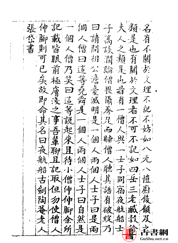 《夜航船》,明代张岱( 著名文学家、史学家, 著有《陶庵梦忆》和《西湖梦寻》等名 著)撰。全书二十卷,按类分为二十部,以词条的方式撰写。从天文地理到经史百家,从三教九流到神仙鬼怪,从政治人事到典章沿革,内容广采博收,涉及广泛,是一部百科全书类的 著作。《夜航船》并非高深莫测的古书,而是用较为浅显的文言叙述四千余个文化常识段子,这些条目绝大多数都是作为一个有文化的人所必须熟知的内容。虽然也收录了一些现在看来荒诞不经的内容,但作为古人的情趣笑谈,有助于我们了解古代的一些文化状况,也未尝不可以看看。